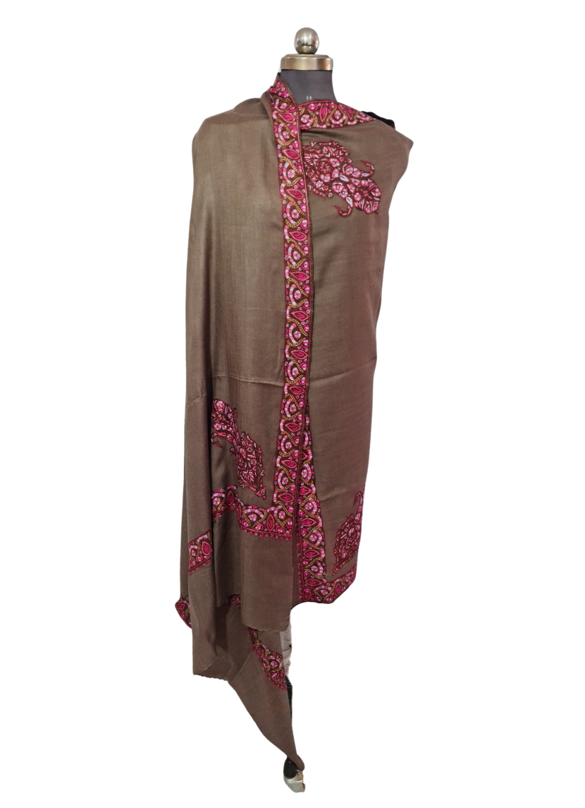 The Tosha Shawl, radiating brilliance and allure, showcases the exquisite Sozni Embroidery across its soft and warm fabric. The masterful needlework features charming vines and intricate Bootis, reflecting the artistry and elegance of the craft. Hand-spun and hand-woven, this shawl is a testament to the skill, dedication, and passion of the artisans who pour their heart and soul into creating such masterpieces.